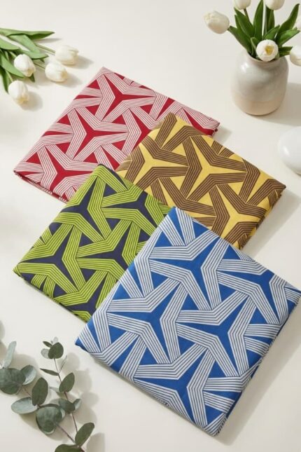 Each piece features a bold geometric pattern inspired by modern design aesthetics, offering a contemporary look while maintaining a timeless appeal. The vibrant color range includes deep blues, refreshing greens, warm reds, rich oranges, and subtle neutral tones, allowing designers and creators endless styling possibilities.